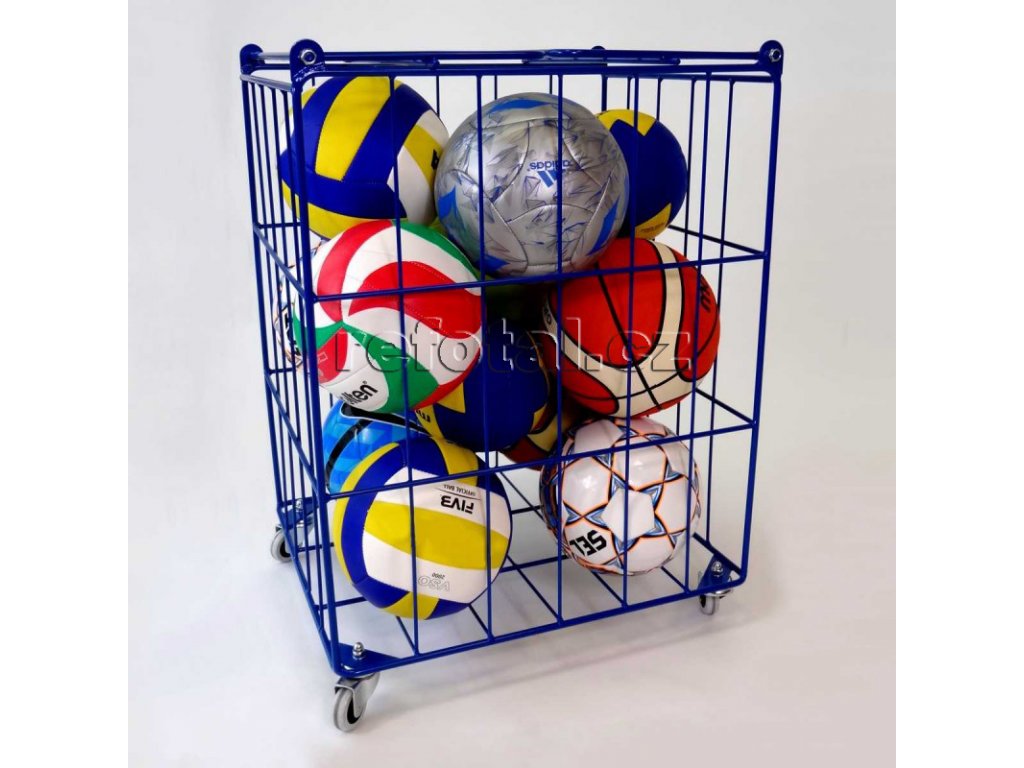 Úschovný uzamykatelný kovový vozík na míče. Odolná konstrukce. Rozměry V 69, H 45, Š 52 cm. Základní barva světle šedá (RAL 7035), modrá (RAL 5010).